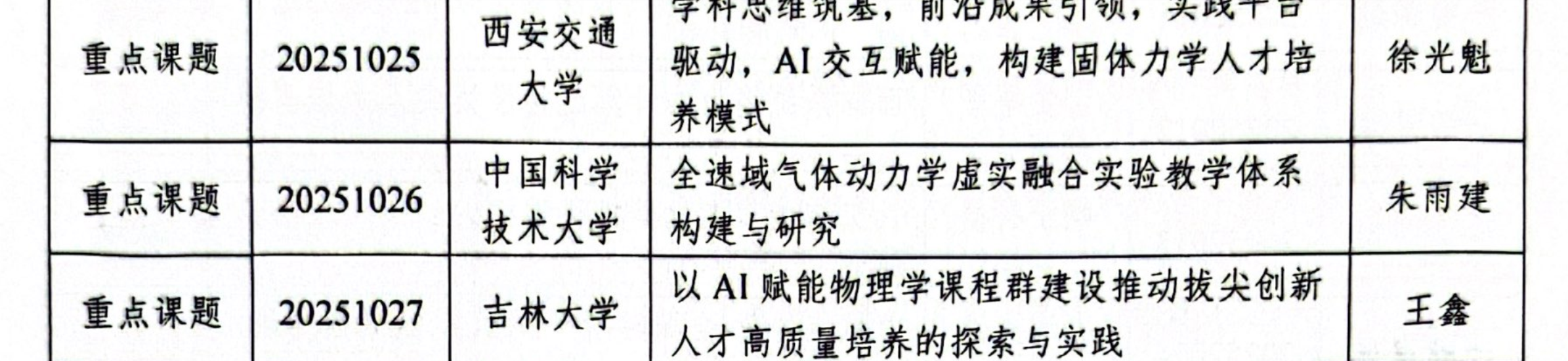 近日,2025年度基础学科拔尖学生培养计划2.0研究课题立项名单公布,中心朱雨建老师的“全速域气体动力学虚实融合实验教学体系构建与研究”获重点课题立项。