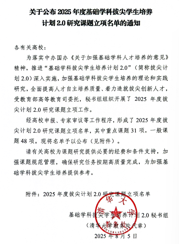 - 2025-08-08朱雨建老师的项目获2025年度基础学科拔尖学生培养计划2.0研究课题-重点课题立项