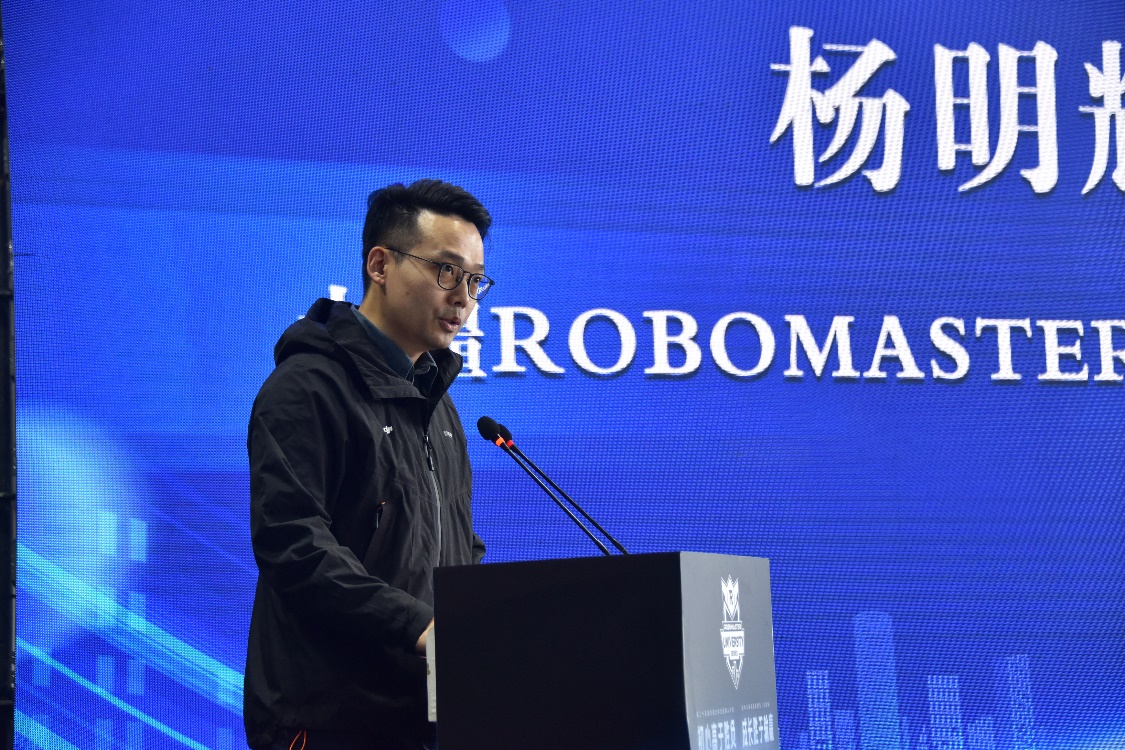 随后,大疆RoboMaster 高级运营总监杨明辉在致辞中对中国科大为赛事顺利举办提供的大力支持表示衷心感谢。他指出,赛事始终秉承“为青春赋予荣耀,让思考拥有力量,服务全球青年工程师成为追求极致、有实干精神的梦想家”的理念。他期待通过将真实的产业需求转化为赛场命题,不仅能让同学们在实战中锤炼能力,更能借此契机促进地区高校之间的交流学习,为地方科技创新产业发展持续助力。